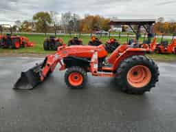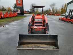 2007 Kubota L4400DT tractor with 43 horsepower 4 cylinder Kubota diesel engine, 4WD, and 8F/4R mechanical shuttle transmission. Category I 3 point hitch and independent rear PTO with 37.5 horsepower. R4 industrial tires. Metal canopy with rear view mirror. Rear work light. 440 hours. Woods LC108 loader with 72″ two lever quick attach bucket features 2,375 lb lift capacity and 108″ lift height. $17,500+tax.