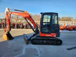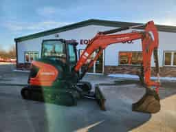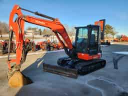 2022 KX057-5 excavator with 46.4 horsepower Kubota diesel engine, rubber tracks, and 13,051 lb operating weight. 6′ 5″ angle blade. Cab with heat, A/C, and radio. Boom and cab lights. Comes with trenching bucekt, thumb, and mechanical quick coupler. 12′ 9″ max digging depth and 20′ 7″ digging radius. 560 hours. $69,700.