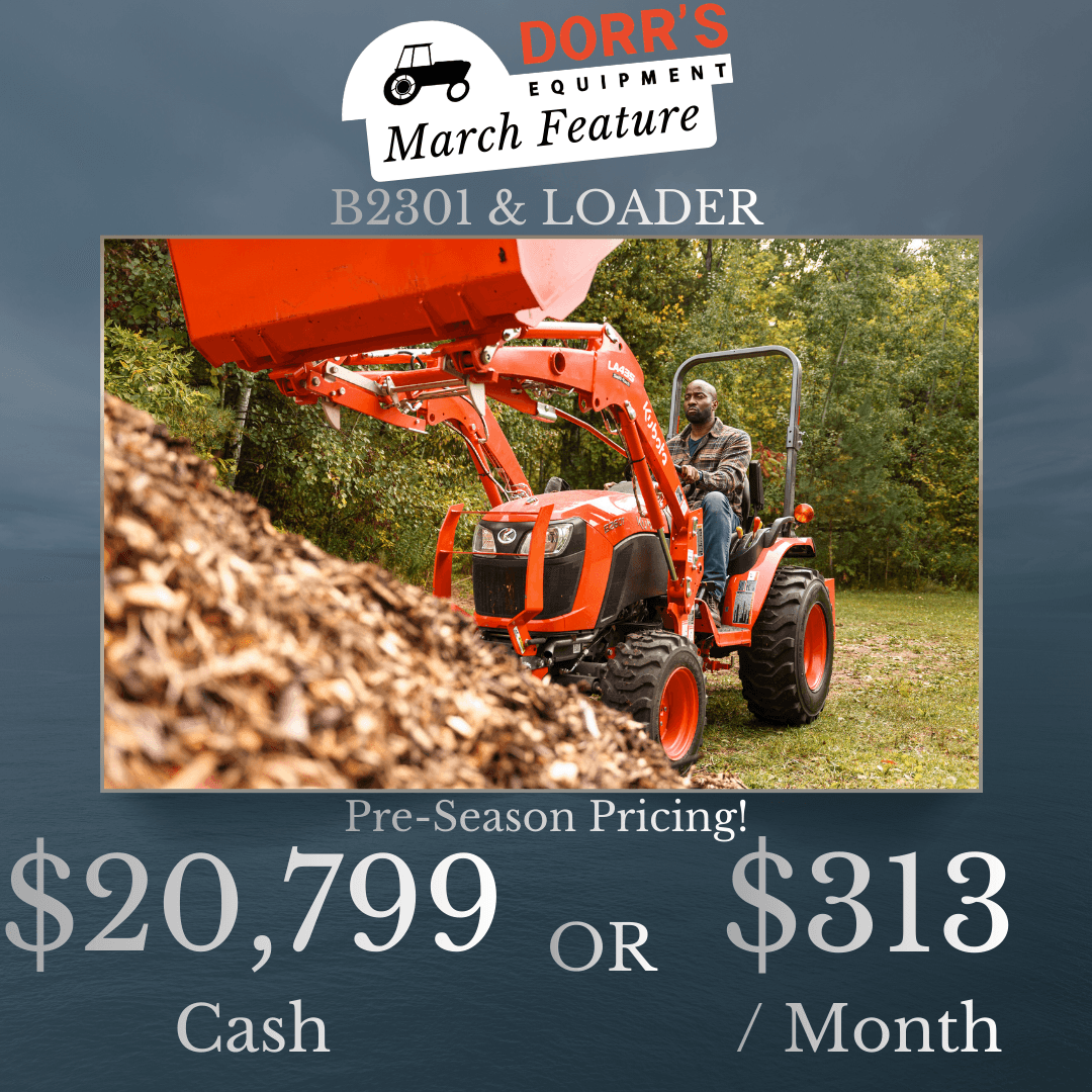 New B2301 tractor with LA435 loader and 54″ quick attach bucket. 23 horsepower Kubota diesel engine & 3 range hydrostatic transmission.