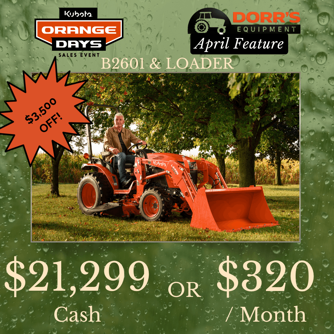 New B2601 tractor with LA435 loader and 54″ quick attach bucket. 26 horsepower Kubota diesel engine, 3 range hydrostatic transmission.