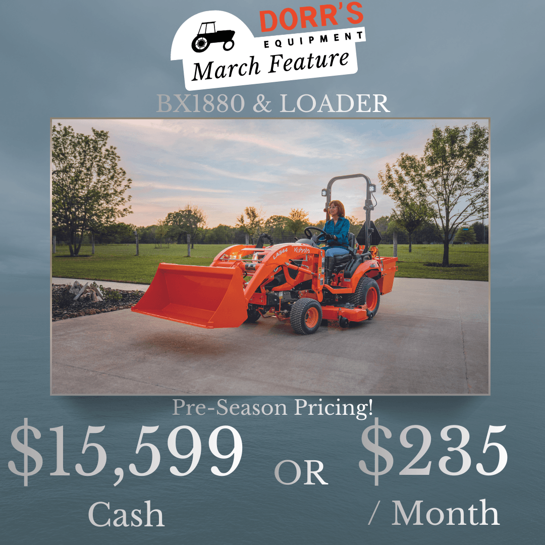 New BX1880 with loader & 48″ quick attach bucket. 18 horsepower Kubota diesel engine & 2 range hydrostatic transmission.