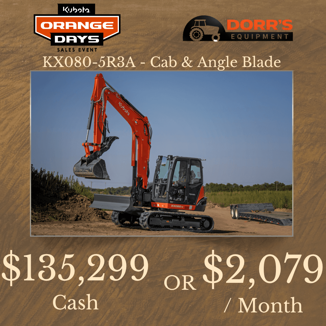 New KX080-5R3A excavator with rubber tracks, angle blade, cab with heat & A/C, mechanical quick coupler, trenching bucket, and hydraulic thumb.