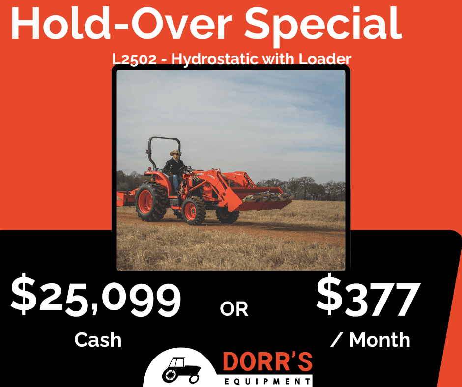 New 2025 Hold Over L2502HST tractor with LA526 loader and 66″ quick attach bucket. 24.8 gross engine HP, 19.5 PTO HP, 3 range hydrostatic transmission.