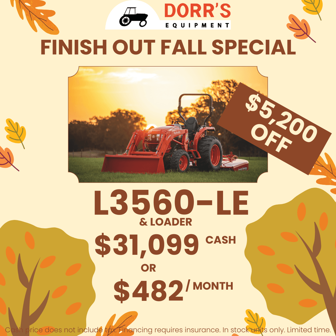 New L3560HST-LE tractor with LA805 loader and 60″ bucket. 35 engine HP, 28 PTO HP, 3 range HST Plus hydrostatic transmission.