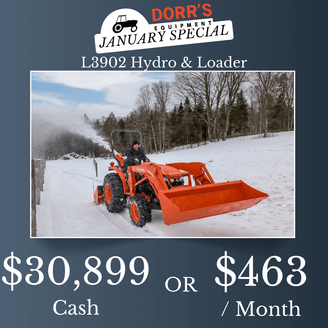 New L3902 with loader and 66″ quick attach bucket. 39 horsepower Kubota diesel engine & 3 range hydrostatic transmission.