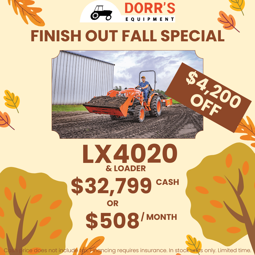 New LX4020HSD tractor with LA545 loader and 60″ quick attach bucket. 39.8 gross engine HP, 32.6 PTO HP with rear and mid PTO, 3 range hydrostatic transmission.