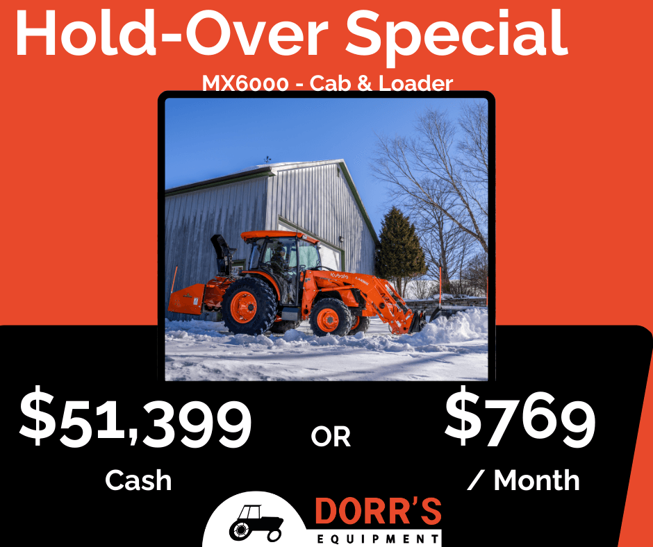New 2025 Hold Over MX6000HSTC tractor with LA1065A loader and 72″ quick attach bucket. 60 horsepower Kubota diesel engine, 3 range hydrostatic transmission, & cab with heat and A/C.